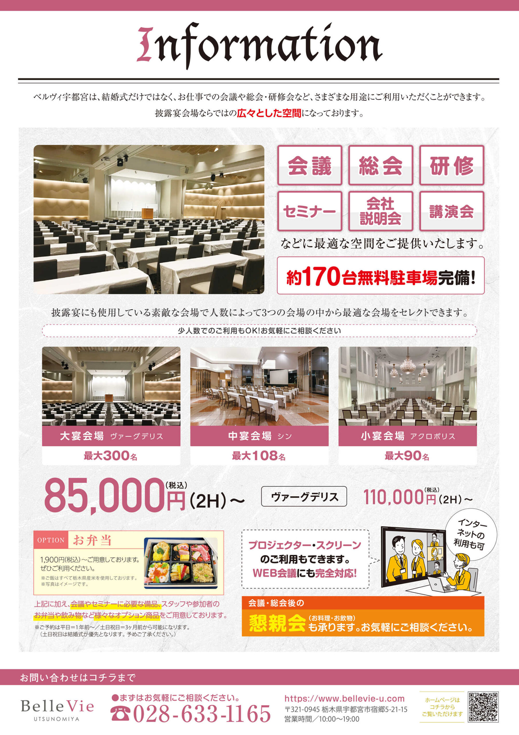 ベルヴィ宇都宮は、会場毎にコンセプトや装いがあり、さまざまなイベントにご対応可能です。少人数でのご利用からセミナーや立食パーティなど最大525名様(シアター形式)まで、大小の多彩な会場をご用意しております。さらにJR宇都宮駅東口から徒歩10分、タクシー利用でしたら3分とアクセスしやすい場所にございます。無料駐車場(170台)も完備しておりお車でのご来館の方にもその利便性の良さで好評をいただいております。ご人数や目的・ご要望によって最適な会場・ロケーションをご提案いたします。お気軽にご相談くださいませ。